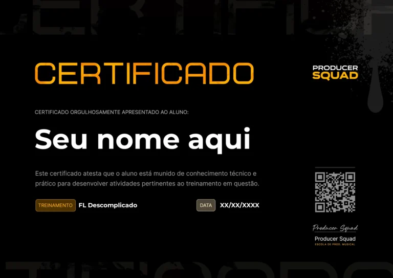 Ao concluir sua jornada na Producer Squad, você recebe um certificado oficial de conclusão, validando sua evolução técnica e prática no universo da produção musical.
