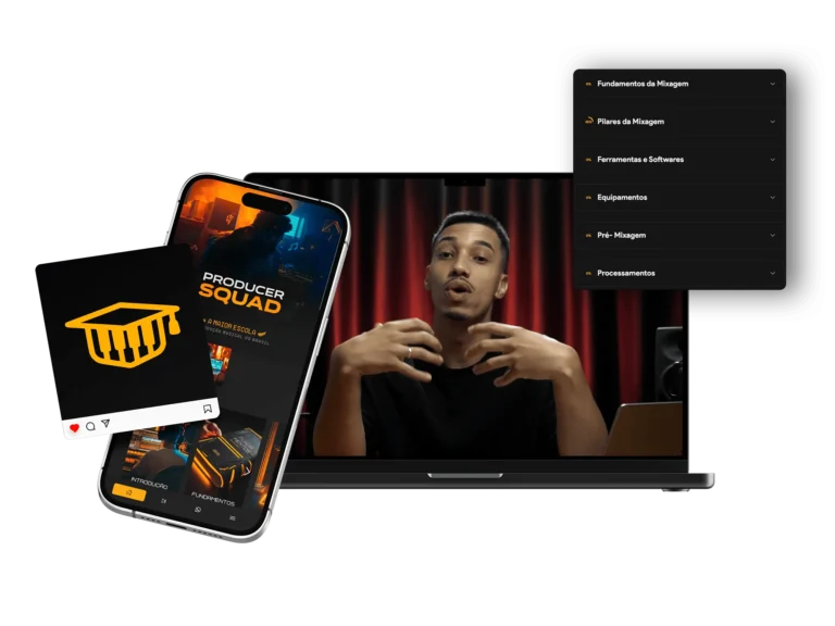 FL Studio, mixagem, equipamentos, escrita musical e vendas, mentores com todo o conhecimento de livros e conteúdos do áudio no seu bolso 24h.